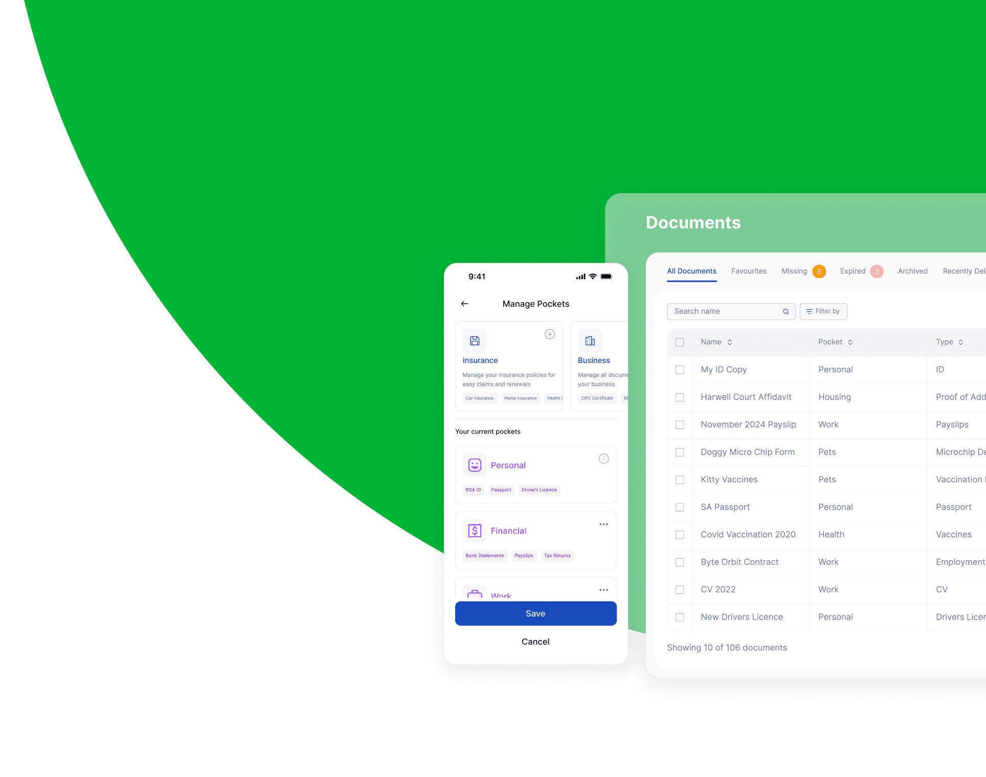 Predefined pocket categories like Health, Work, Financial, and more ensure everything has a home.